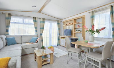 Our two bedroom Platinum home has one double bedroom, one twin bedroom, and a pull-out bed settee which acts as a good-sized double bed in the living room. The spacious lounge and fully-equipped kitchen feature modern furnishings, a smart television, and large windows offering stunning views of the surrounding landscape. There is also a stunning sun deck for outdoor dining. Guests can bring along up to two well-behaved dogs in this accommodation type.