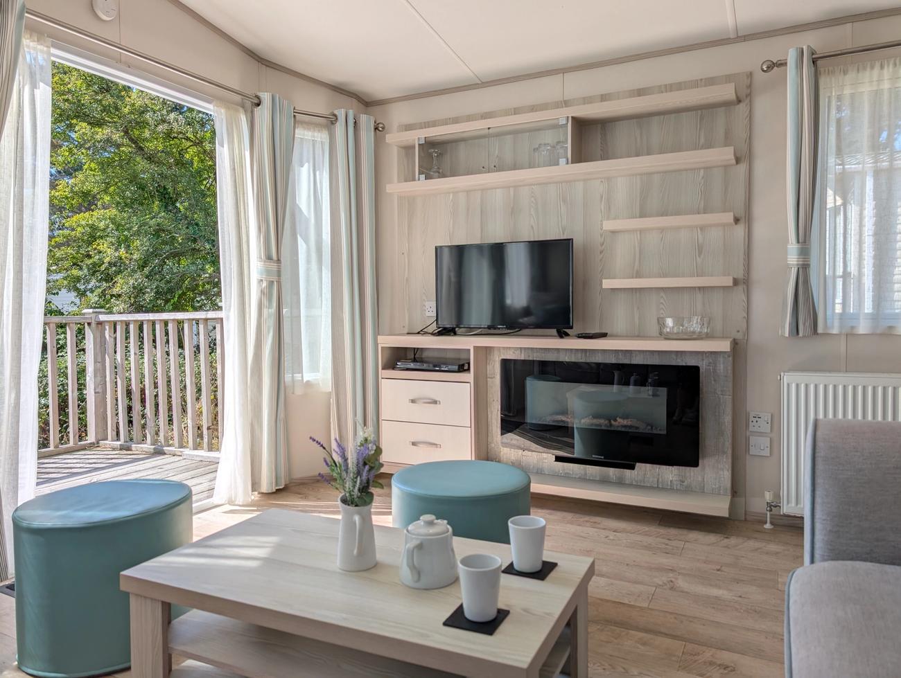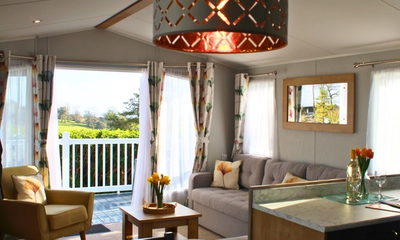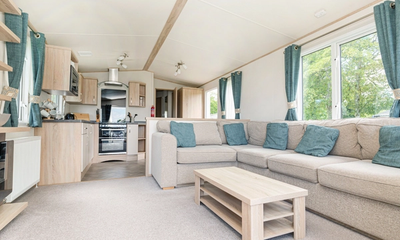 Get the holiday started from the moment you arrive by unlocking the door to one of our brand-new Platinum holiday homes. The spacious living area invites relaxation, featuring modern furnishings, a smart television, and large windows that bathe the room in natural light, offering stunning views of the surrounding landscape.