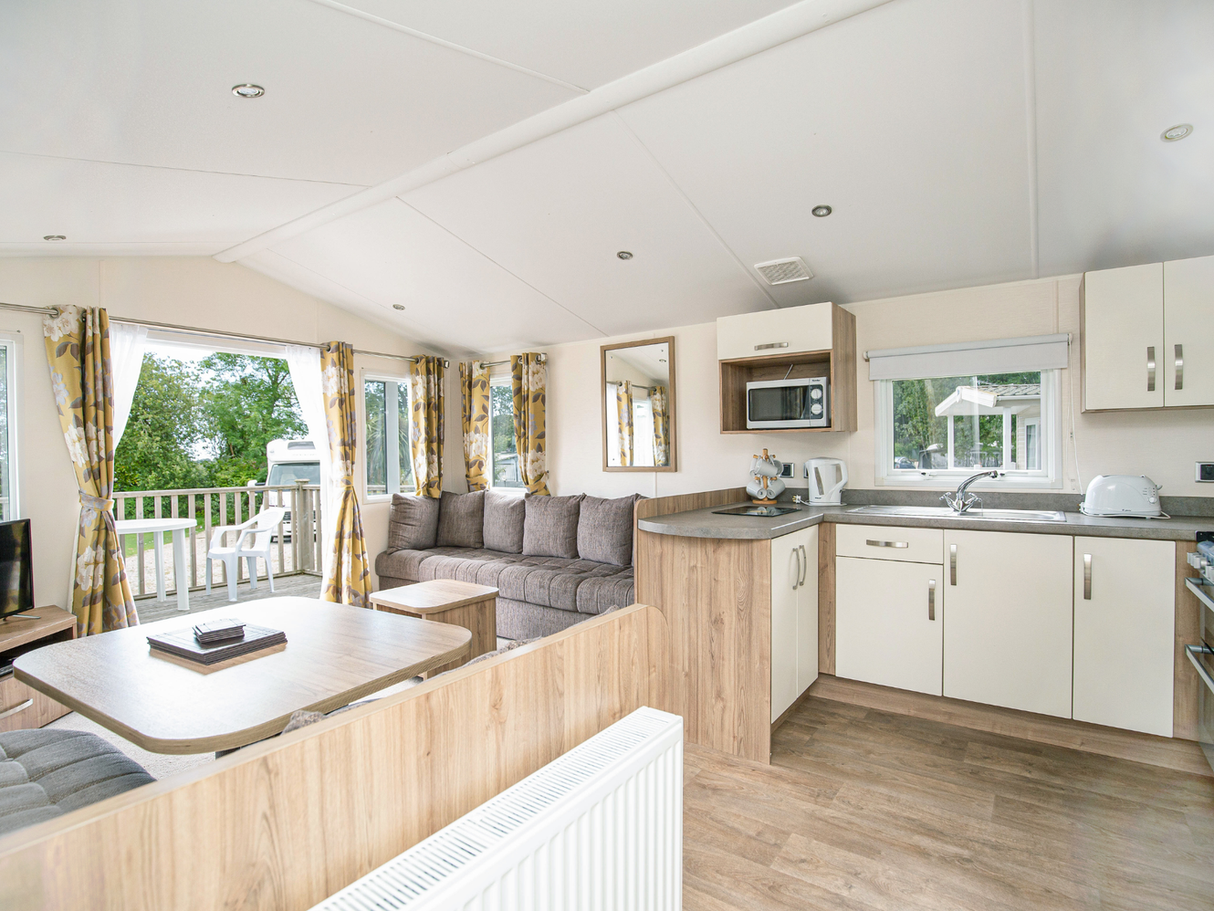 Comfortable and modern, our spacious Bronze three-bedroom holiday home provides everything you need, making your stay a real home from home. With one double and two twin bedrooms, there is also a pull-out bed settee which acts as a good-sized double bed in the living room. Enjoy the convenience of a fully-equipped kitchen, allowing you to savour home-cooked meals while on holiday. The living area, with a Freeview television and DVD player, creates a cosy atmosphere for quality time with family or friends. The spacious layout extends outdoors to your private sun deck. Plus, all our holiday homes have full-central heating. Each holiday home offers scenic views of the surrounding hills, and valleys, and extends to the coast. Guests can bring along up to two well-behaved dogs.