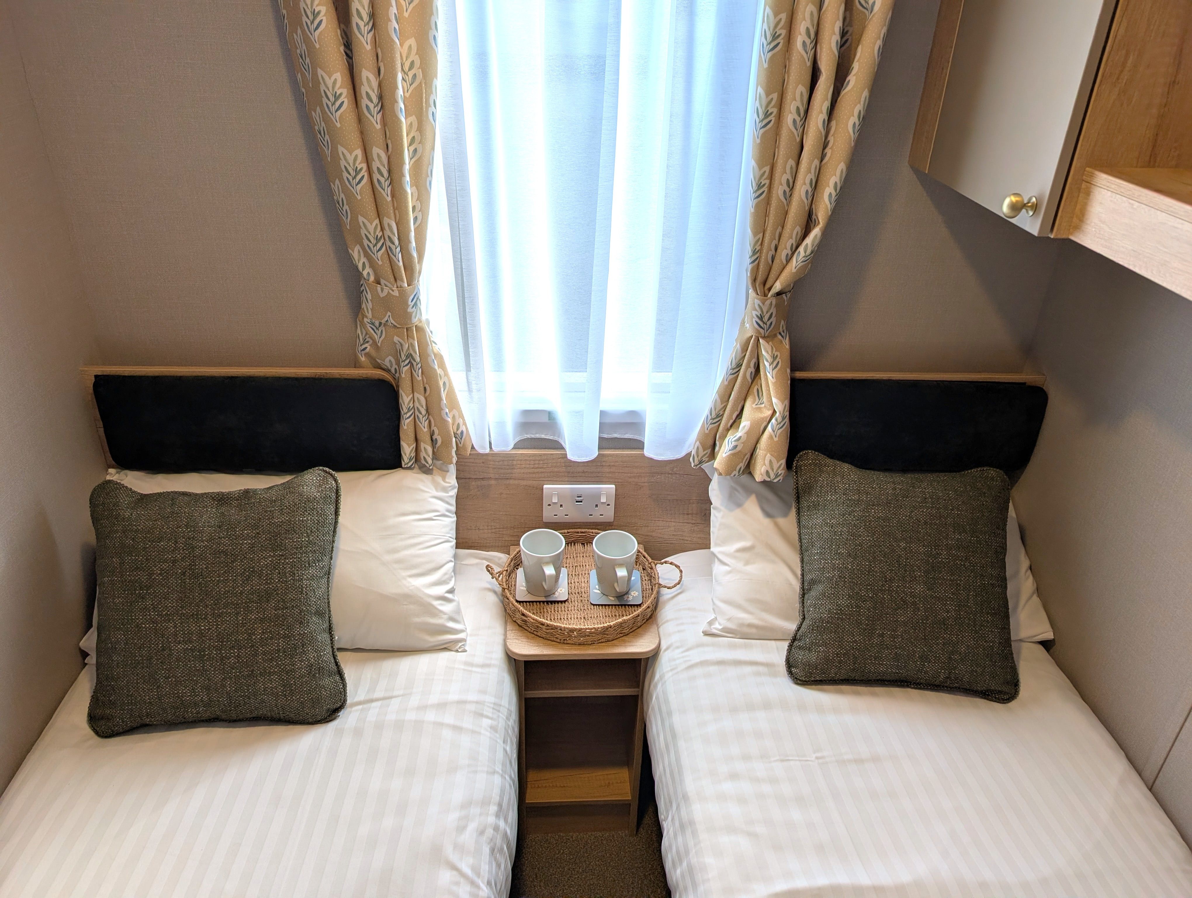 Our two-bedroom Platinum holiday homes are the next level in luxury. Our thoughtfully designed interiors and home-from-home comforts will make your stay one to be remembered. With one double and one twin bedroom, there is also a pull-out bed settee which acts as a good-sized double bed in the living room. The spacious living area invites relaxation, featuring modern furnishings, a smart television, and large windows that bathe the room in natural light, offering stunning views of the surrounding landscape. Enjoy the convenience of a fully-equipped kitchen, with modern appliances and all the essentials needed to make delicious meals. Step outside onto the sun deck, which offers beautiful views of the Cornish countryside and sea, so you can enjoy your morning coffee or unwind with a glass of wine as you soak in the serenity of the surroundings. The outdoor space is perfect for al fresco dining or simply basking in the fresh air. Plus, all our holiday homes have full-central heating.